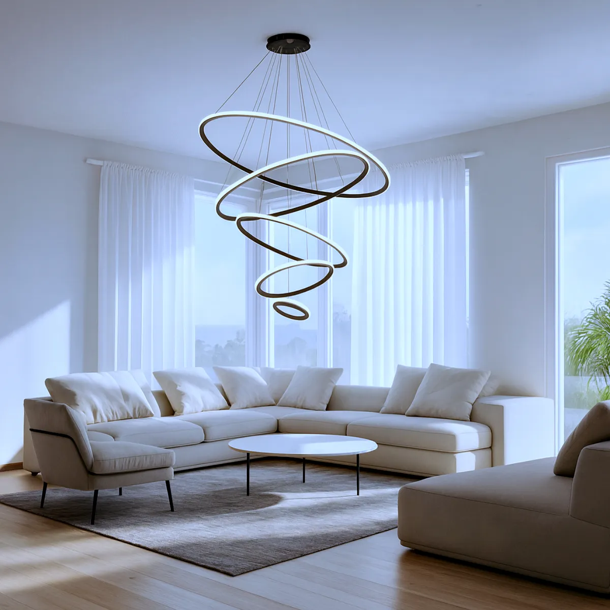 Apresentamos o Lustre Pendente Moderno LED 5 Anéis Arcos Luxo, uma peça que combina design contemporâneo e tecnologia avançada para transformar qualquer ambiente. Ideal para salas de estar, jantar, escritórios ou áreas de convivência, este lustre oferece uma iluminação aconchegante e sofisticada, perfeita para criar uma atmosfera elegante e acolhedora.